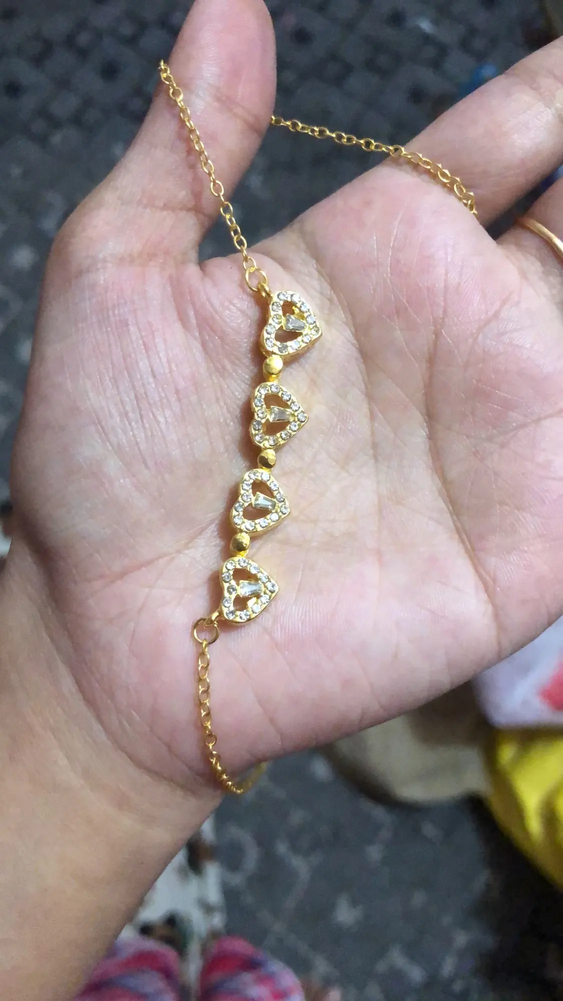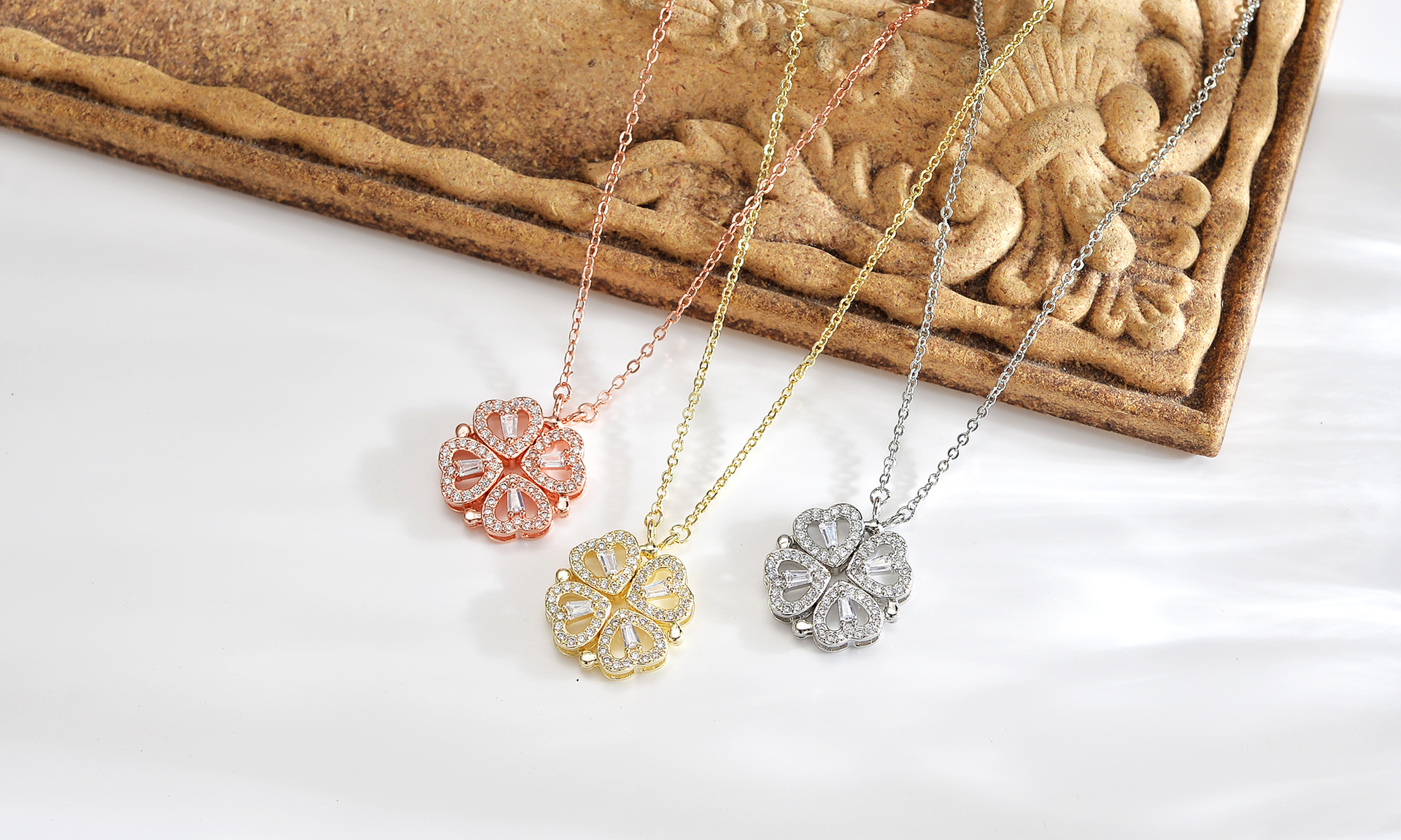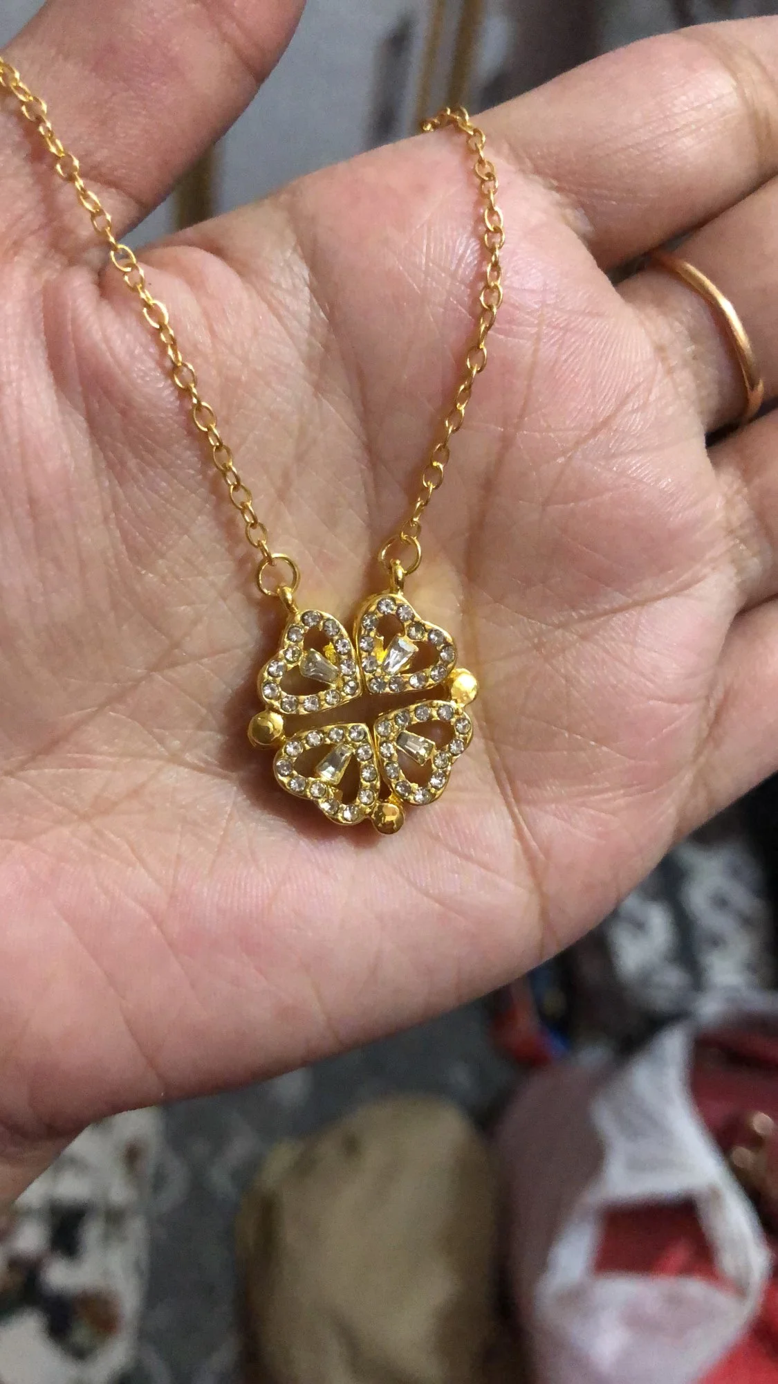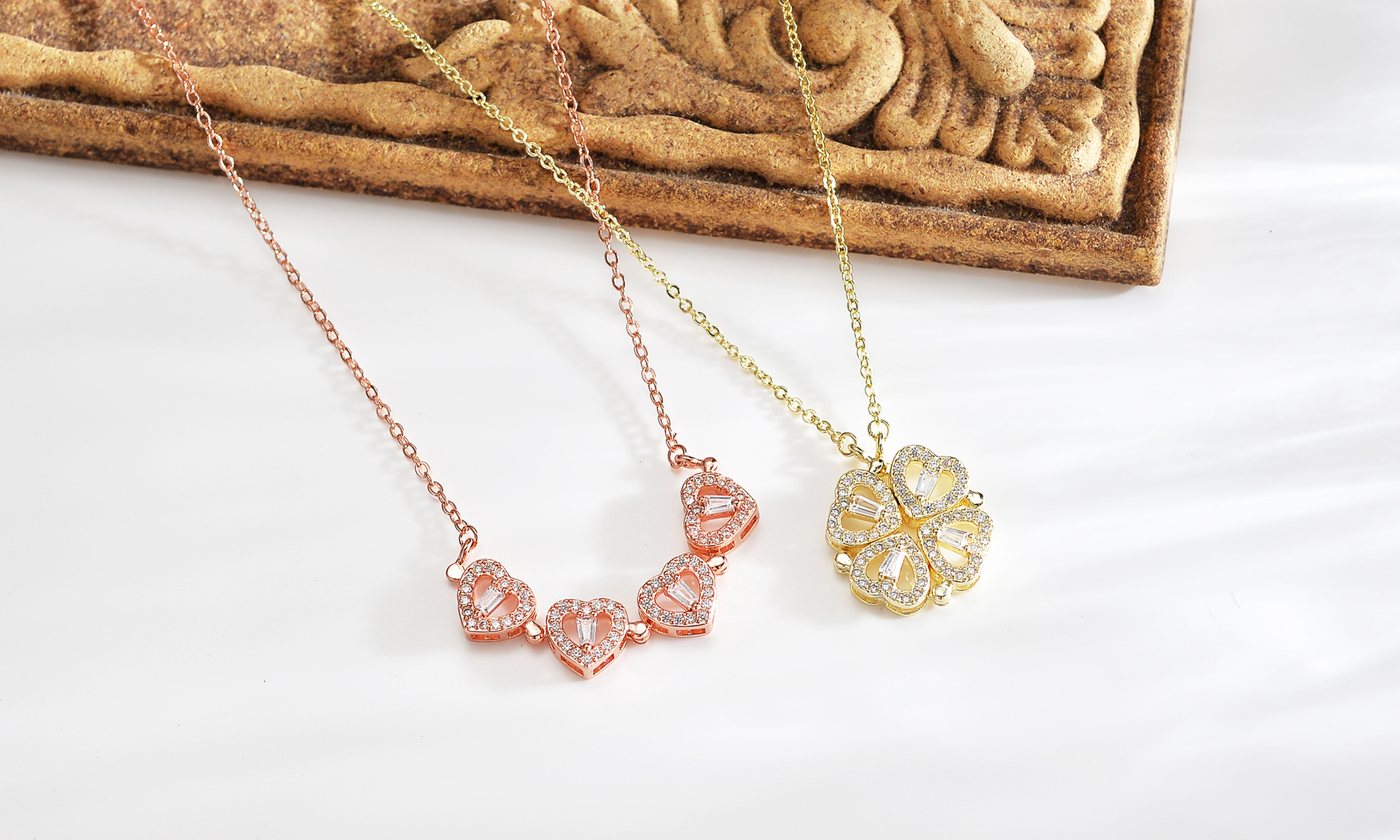gold layered necklace — one chain with a four-leaf clover pendant and the other with small heart-shaped pendants.
