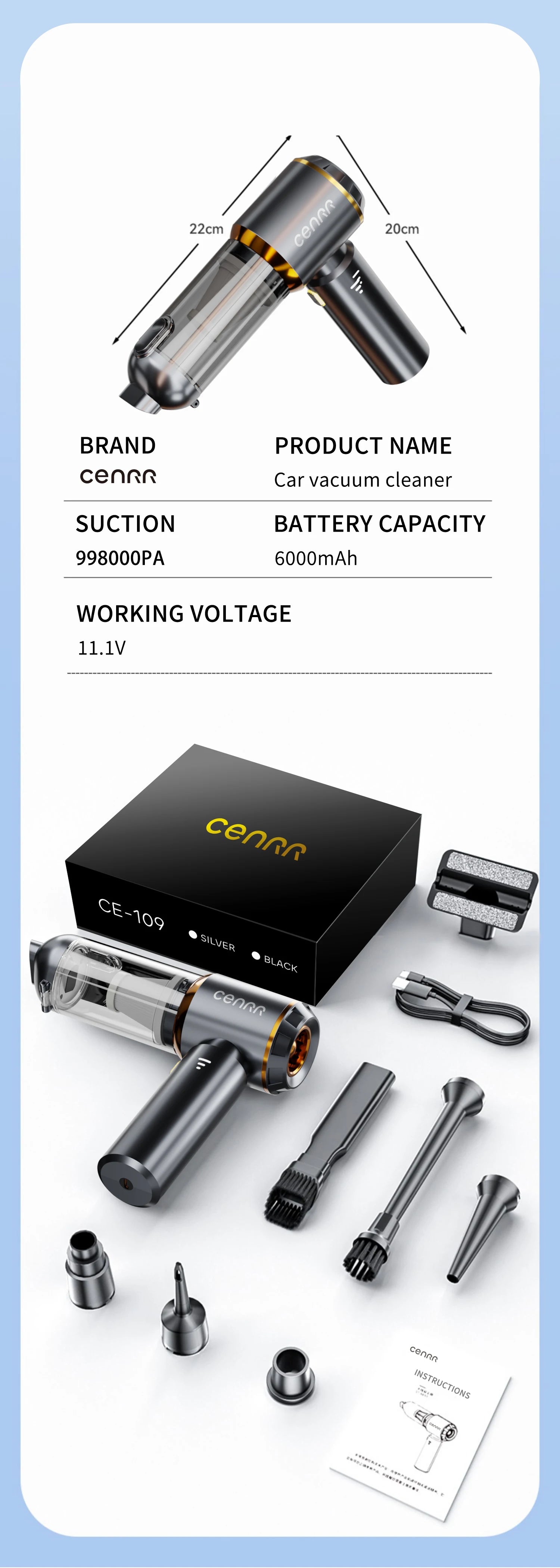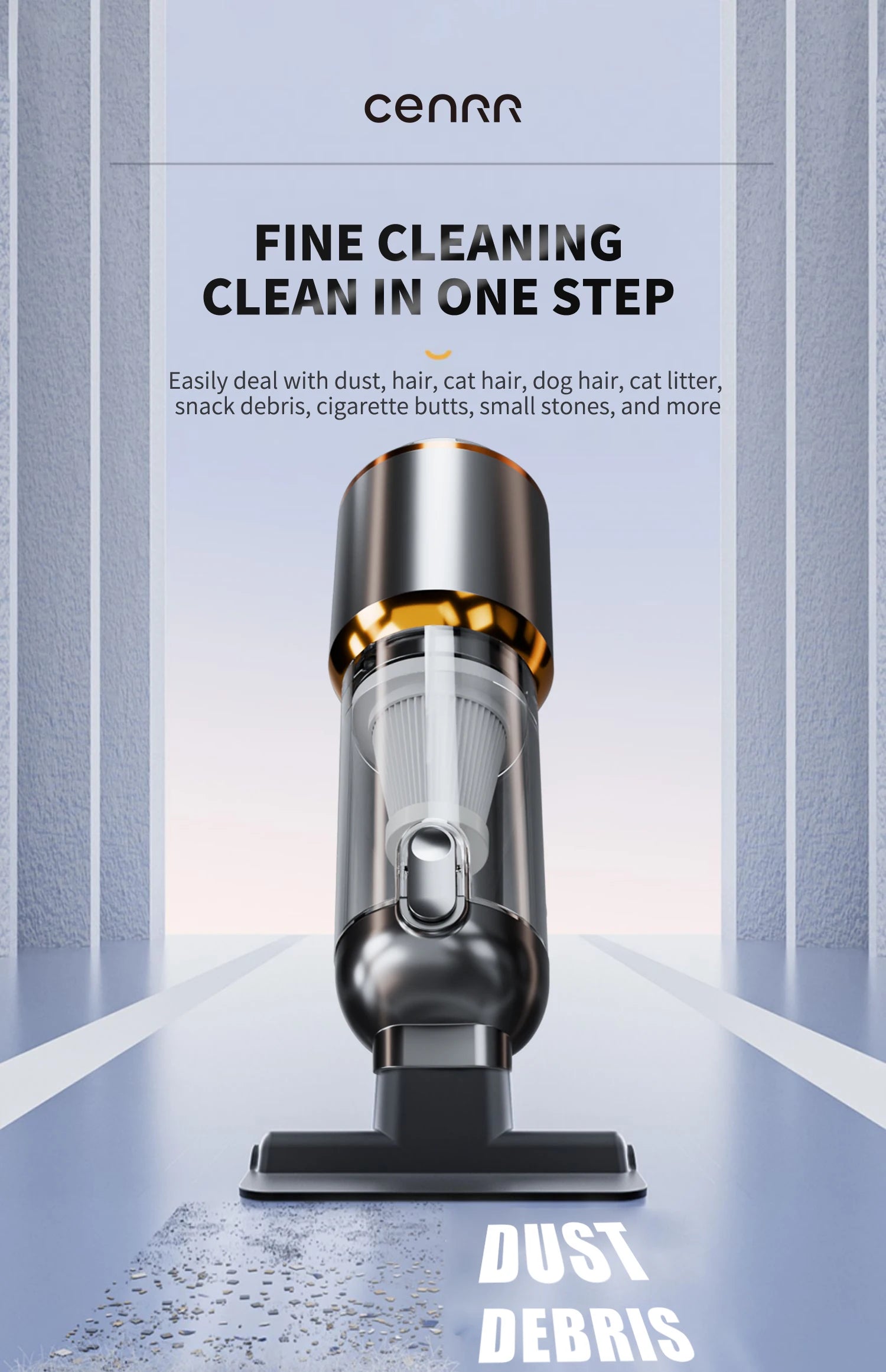 Keep your car, home, or office spotless with the CENRR Cordless Handheld Vacuum Cleaner. This portable vacuum features strong suction to efficiently pick up dust, crumbs, pet hair, and debris from hard-to-reach areas.